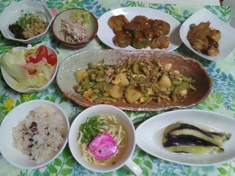 ピーマンの肉詰め照り焼きとゴーヤ–炒めでお昼ご飯。