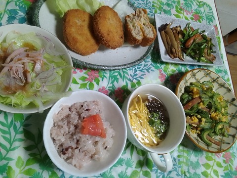 鮪メンチカツとゴーヤー炒めでお昼ご飯。