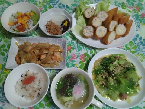 鮪のチーズロールカツとササッとレタス炒めでお昼ご飯。