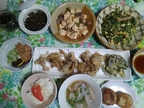 中味汁と舞茸と小さなゴーヤーの天ぷらでお昼ご飯。
