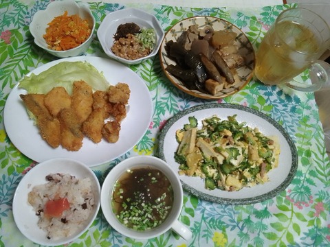 秋鮭フライと厚揚げとゴーヤ−の炒め物でお昼ご飯。