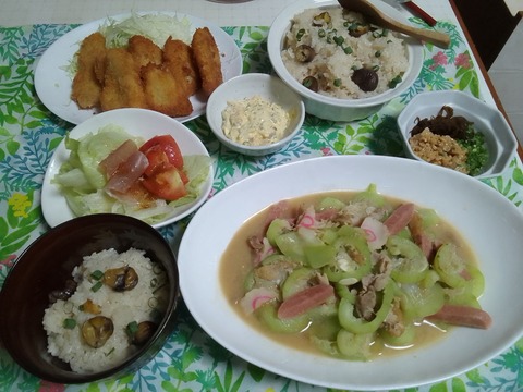 ヘチマ炒めと白身魚フライと栗ご飯でお昼ご飯。