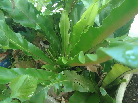庭のオオタニワタリと‥鶏ハンバーグのサンドで朝食。