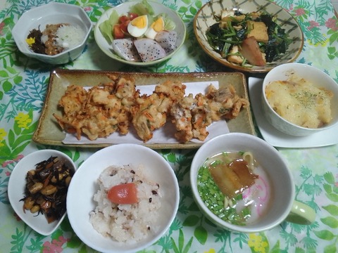 鮪のかき揚げと厚揚げのニラ炒めでお昼ご飯。