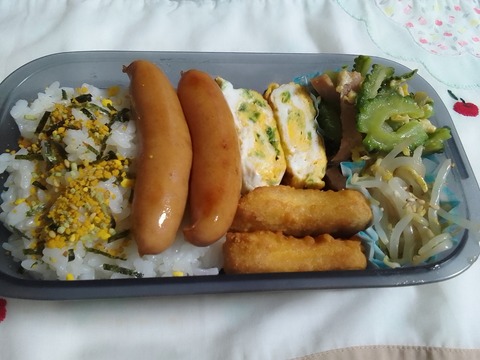 秋鮭の唐揚げと鮪の照焼きとゴーヤ−でお昼ご飯。