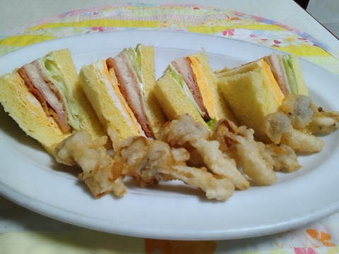 自家栽培のオクラ揚げを添えて2種のチーズのビアハム卵サンドで朝食。
