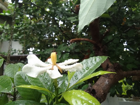 定番のポーク卵サンドイッチで朝食・・と‥くちなしの花。