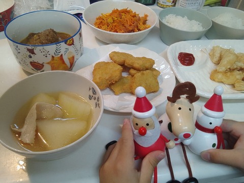 孫の夕食…白身魚の唐揚げと人参シリシリ?。