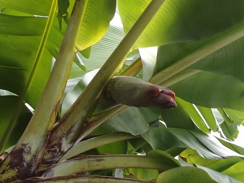 庭のバナナの花・・ソフトチキンサンドイッチで朝食。