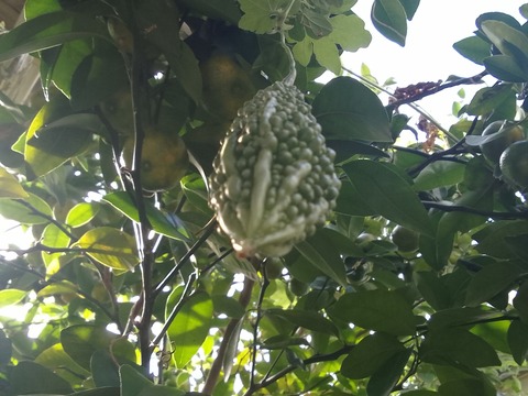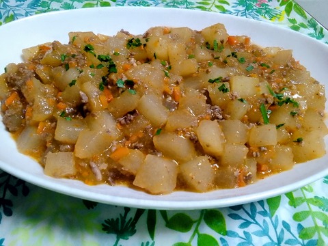 豚足と冬瓜の煮つけと鶏の唐揚げと人参シリシリでお昼ご飯。