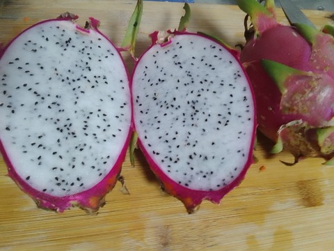 ドラゴンフルーツ白赤を添えて厚切りのハムエッグサンドで朝食。