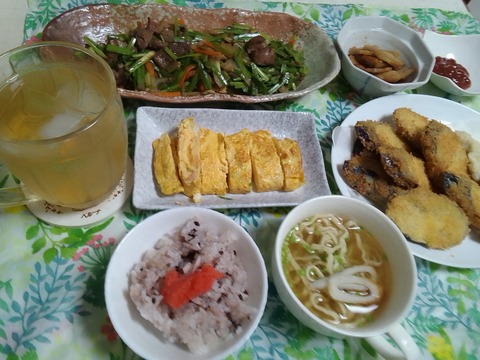 レバーニラ炒めとむき海老の卵焼きと茄子フライでお昼ご飯。