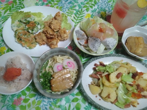 鶏の唐揚げとはんぺん焼きと沖縄そばでお昼ご飯。