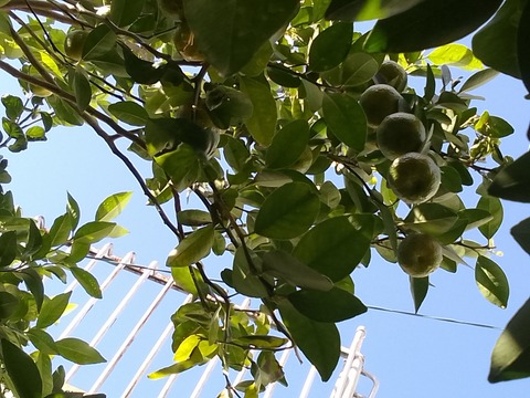 庭のシークヮサーと‥チキンハンバーグのサンドで朝食。