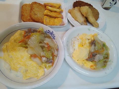 島らっきょう揚げと‥刻みポークの厚焼き卵サンドで朝食。