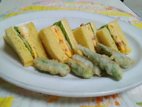 自家栽培のオクラを添えてポーク入り厚焼き卵のサンドで朝食。