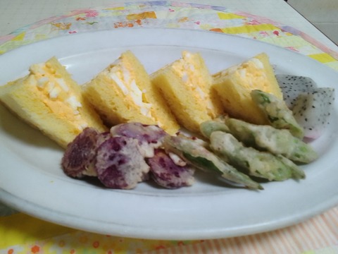 市販のパンで卵サンドの朝食・・ゴ-ヤ-リング添え。