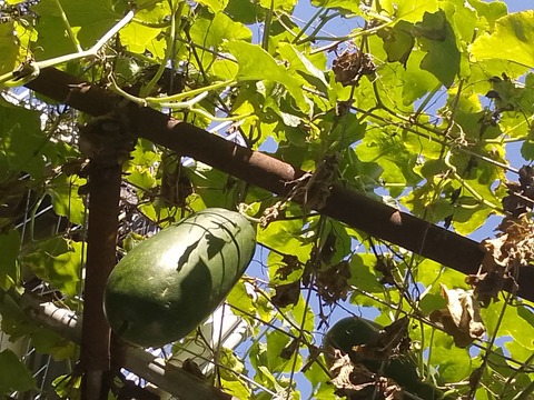 庭の冬瓜と‥島ラッキョウを添えてソフトチキンカツサンドで朝食。