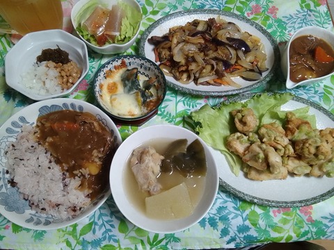 茄子の味噌炒めとカジキの枝豆揚げでお昼ご飯。