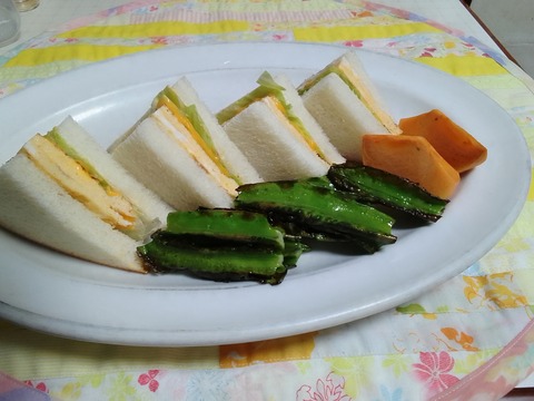 フジ豆揚げと柿を添えてトマトエッグサンドで朝食。
