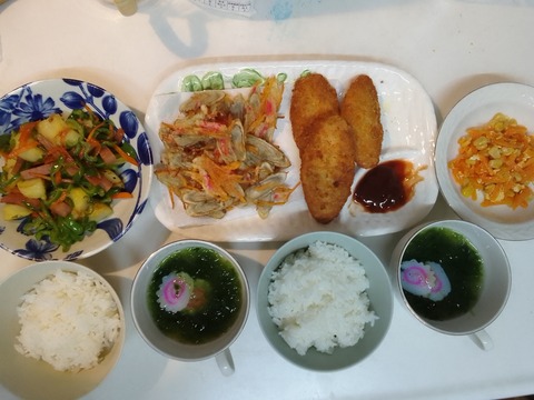ミジュンのフライとゴーヤ−炒めでお昼ご飯。