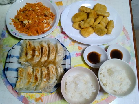 豚足と冬瓜の煮つけと鶏の唐揚げと人参シリシリでお昼ご飯。