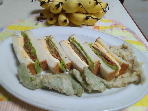 市販のパンで卵サンドの朝食・・ゴ-ヤ-リング添え。