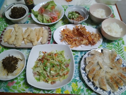 鶏のから揚げとキャベツ芋の葉炒めでお昼ご飯。